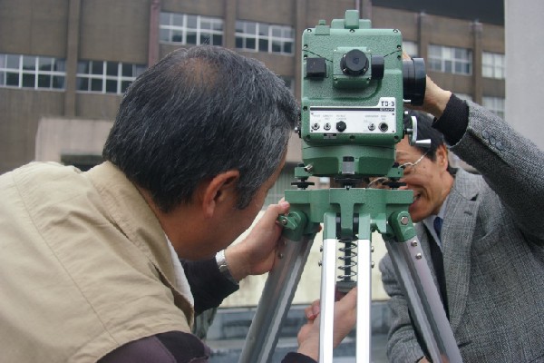 ■経緯儀を組み立てる。水平方向、南北方向を定める。