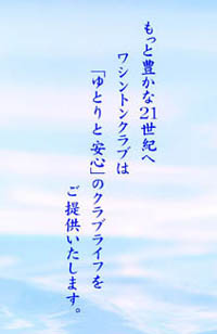 | 「21世紀型健康生活」が待ち望まれています。 ワシントンクラブは、ライフスタイルの変化や新しい情報社会に対応したサービスアイテムをトータルに提供させて頂く、新しいスタイルのクラブです。心ゆくまでリゾートライフをお楽しみください。勿論、ビジネスシーンのサポートも充実。 ゆとりと安心のクラブライフをご提案します。 |