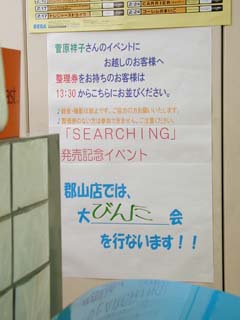 開始30分前くらいになると店員がイベント待ちの人を集め始めたのでそっちに行くと・・・ 何故か行列の先頭に・・・ずっと待ってた訳じゃないから良いのかな?と思ったけど問題なさそうなのでそのまま整列。 すると次から次へと人が来るわ来るわ。階段に並んでたんだけどすぐに数列に イベント開始10分くらい前には60人程になってました(20人程の列x3) そこに丁度,さっちゃんとマネージャーさん,キングレコードのミッシー,KMEの人(HP作成担当の人かな?)の3人が到着。 そして,ミッシーが今回の会場でやる事の説明。 毎回会場でくじを引き,札に書かれた「何か」+握手+数分の会話をするとの事。 説明が終わりしばらくして,さっちゃん登場。 さっそく今回やる事を決めるための札をひく・・・結果「ごろごろ」。 そして「ごろごろ」の説明(笑)・・・猫や犬にやるアレの事らしい^^; ・・・って俺がトップバッターかい! 美味しいけど,かなり恥ずかしい^^; 会話は頭が真っ白になってしまったので何処からどうやって来ただので終わってしまった^^;;;; (まぁ,最初だしこれもアリかな) あとは近くで最後まで経過を見守る・・・って20人目位までは私と状況ほとんど一緒だった(笑) 周りから突っ込みとフォローが入りながら(笑)も平和なうちに2時間近くで終了。 私以外の祥イベント常連組はトリを狙ってたようで最後尾に固まってました^^; 締めでさっちゃんから一言の後に,私が「今日の達成率は?」と聞くと「・・・3%くらい・・かな?」との事。 厳しいかも^^; そして,さっちゃんは店の奥の店員休憩室へ消えて行きました・・・