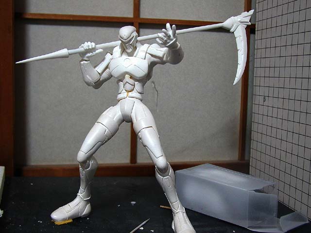 …で、3時頃に目覚めちまう(汗) せっかくなのでガレキのマスキング作業を始めました。 マスキングテープを細くカットしてちょっとはみ出す程度に貼り付けてデザインナイフで塗り分け位置でカット。 タミヤ製のマスキングテープって粘着面が弱くて、糊が残らないのはいいけど…小さい面だとずれやすいですな(>_<) 久しぶりに細かい作業したので要領悪くて上半身と腕アーマーの一部しか作業出来なかったですよ。 この分だと全部終わるまで三日かかりそうな感じ(汗)
