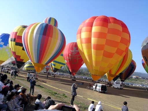 朝早くに起きて佐久市内の河川敷で行われる「佐久バルーンフェスティバル2005」に行きました。 熱気球のイベントなんですが、午前の部のスタートが朝の6:30から(汗) 現場に到着したのが7時頃だったので早い物は飛び立つ寸前でした。 風らしい風がほとんど無かったので上に上がるのは良いのですがなかなか移動してくれなくて困ってたようでした。 去年は去年で風が強すぎてコントロール不能直前だったそうですが^^;