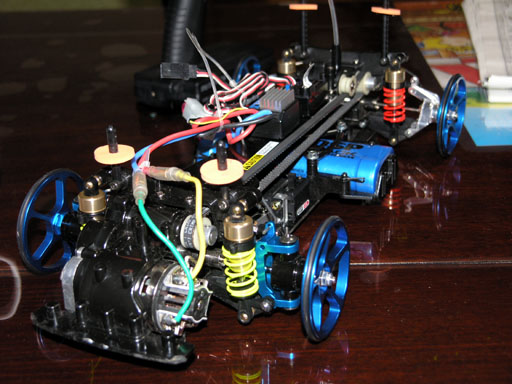 結局、リアダンパーがオイル:#1000、スプリング:ソフト、スペーサー:6mm フロントダンパーがオイル:#1000、スプリング:ミディアム、スペーサー:6mm+1.5mm キャンバーはリア無し、フロントが1.5。フロントを少しトーアウト気味に設定。