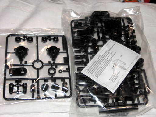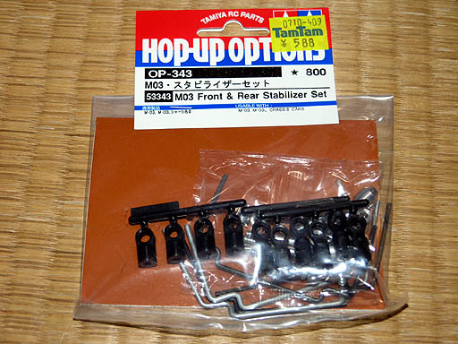 オプションで確保しておきたいのは、スタビライザーにボールデフセット。 スペアパーツは前後のアルミナックル辺りかな? 既に絶版で店頭在庫限りだそうで注意書の紙が入ってました(汗)